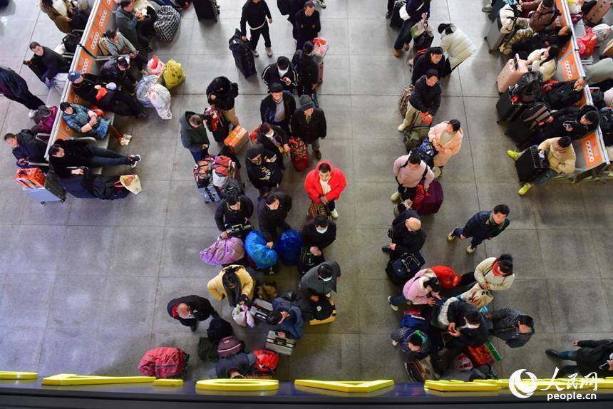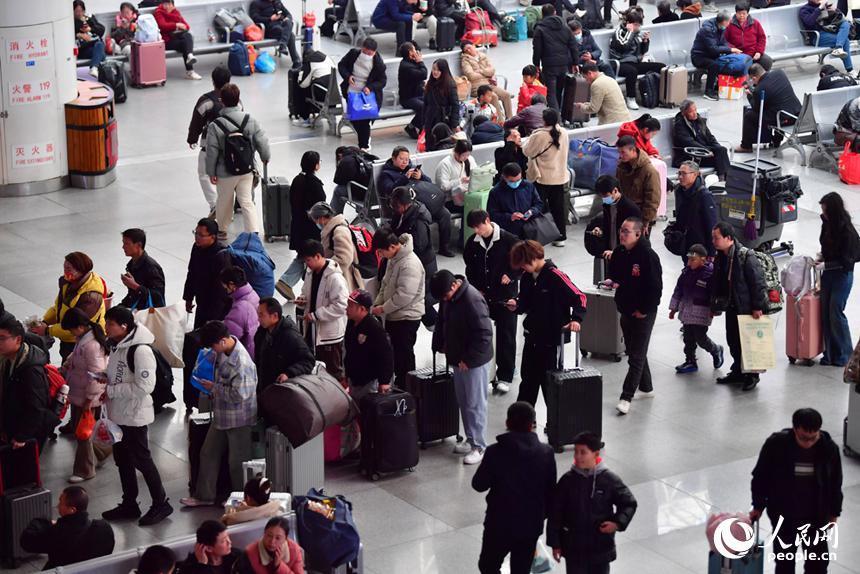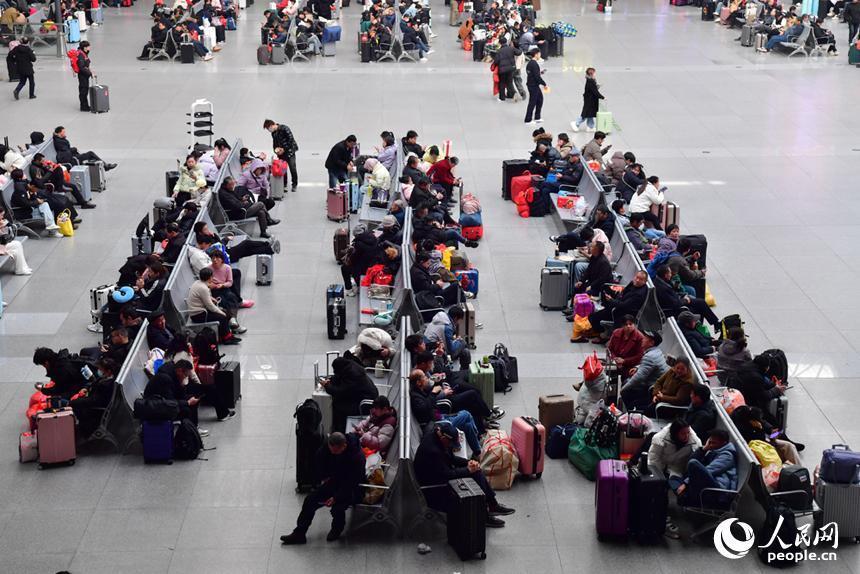 南昌火车站候车室座椅上坐满了候车的旅客。人民网记者 时雨摄人民网南昌2月14日电(记者时雨)14日,江西省南昌火车站候车大厅内迎来大量出行旅客,车站工作人员在各自岗位为旅客提供服务。元宵节后,春运返程与学生返校客流叠加,据预计,未来一段时间,南昌火车站的客流仍将保持高位。