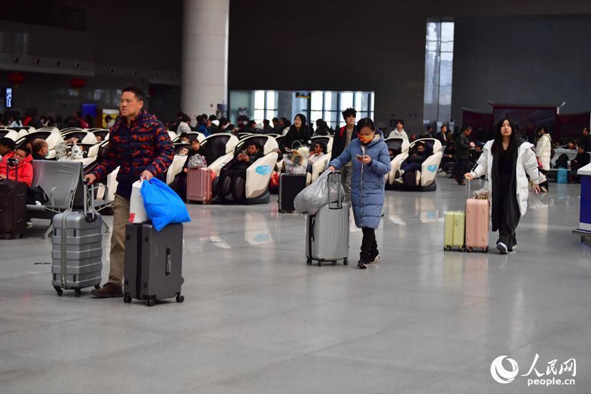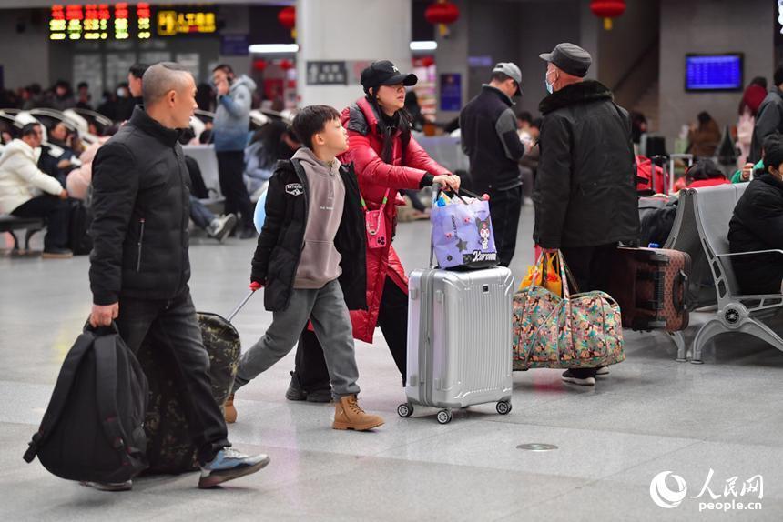 火车站内带着行李赶车的旅客。人民网记者 时雨摄